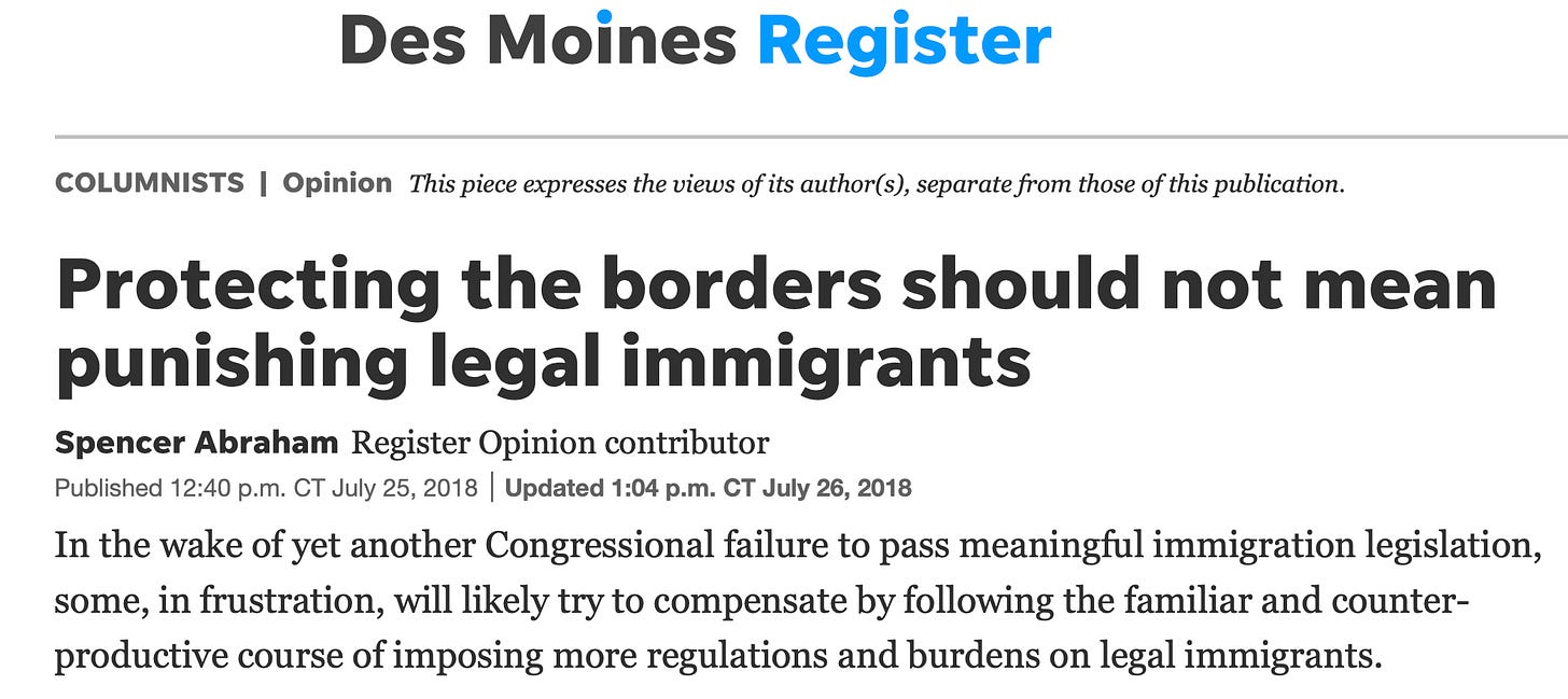 Abraham, in a 2018 opinion column for the Des Moines Register, argued that the Trump administration should do more to acknowledge and promote the benefits of Indian IT companies, which he claimed would "result in more jobs for American workers." The newspaper identified Abraham only as a former cabinet secretary, not a paid lobbyist.