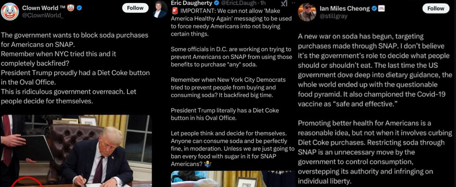 In response, several high-profile accounts began posting nearly identical messages criticizing the proposed reforms. Ian Miles Cheong, who has over 1.2 million followers, claimed "a new war on soda has begun." Eric Daugherty warned followers that officials were "trying to prevent Americans on SNAP from using those benefits to purchase any soda."