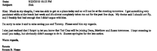 The following month, a team of in-house attorneys from Google, its longstanding law firm Wilson Sonsini Goodrich & Rosati, and Cruz traveled to Austin to meet with Abbott’s staff to discuss the investigation. In an email dated August 23, 2010, Wilson Sonsini partner Renata Hesse emailed an antitrust attorney at Texas Attorney General’s Office, alerting her that Cruz would be among the Google attorneys visiting her office.