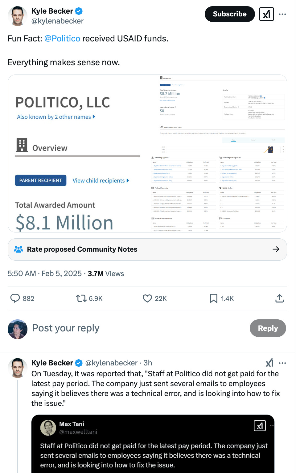 This morning, I woke to several friends and readers asking me about viral social media claims from last night regarding USAID and Politico. The conspiracy theory suggested that ongoing spending cuts at USAID, the foreign aid agency, were shutting down domestic media outlets supposedly dependent on government money. As evidence, several large accounts noted that Politico personnel had failed to receive payroll. Politico management, in an email, attributed the issue to a "technical error" that would be fixed shortly. Yet many suspected a direct connection. Here is one of many viral tweets making this claim:
