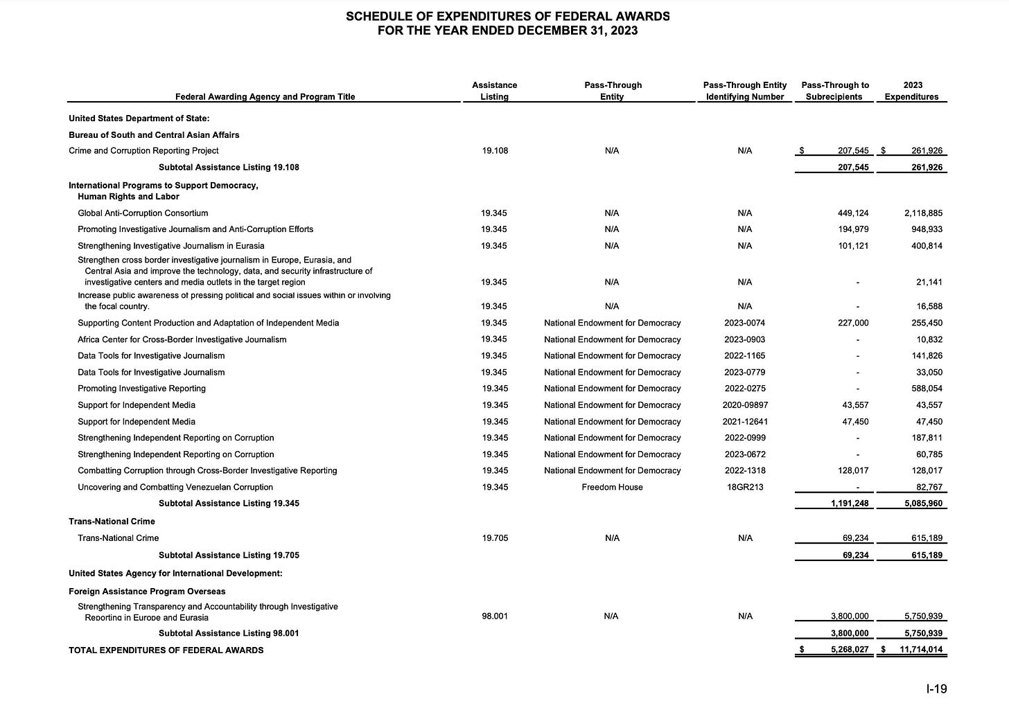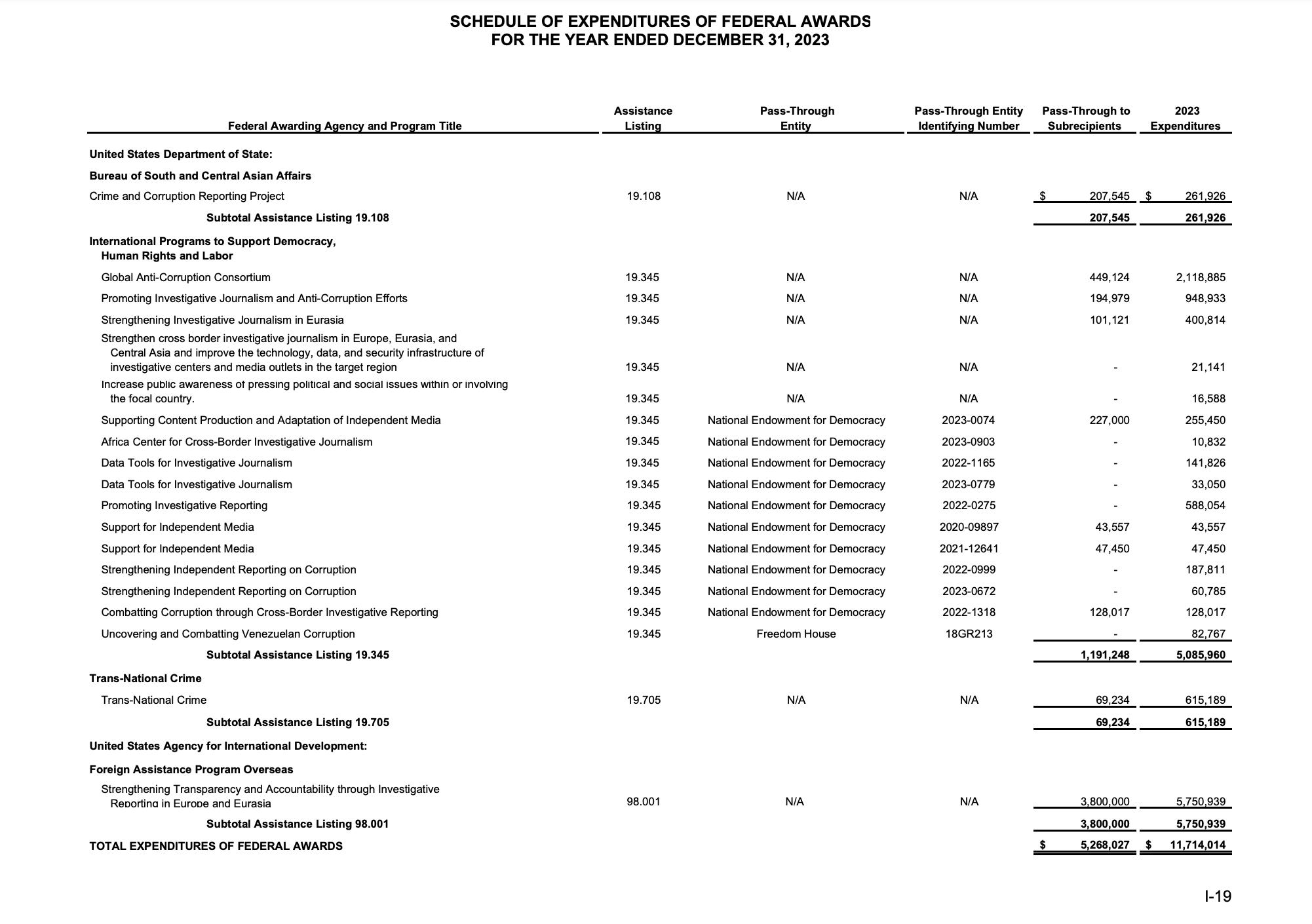 Here is OCCRP’s most recent audit report, showing its government funding sources – $11 million from U.S. agencies, including $5.7 million from USAID.